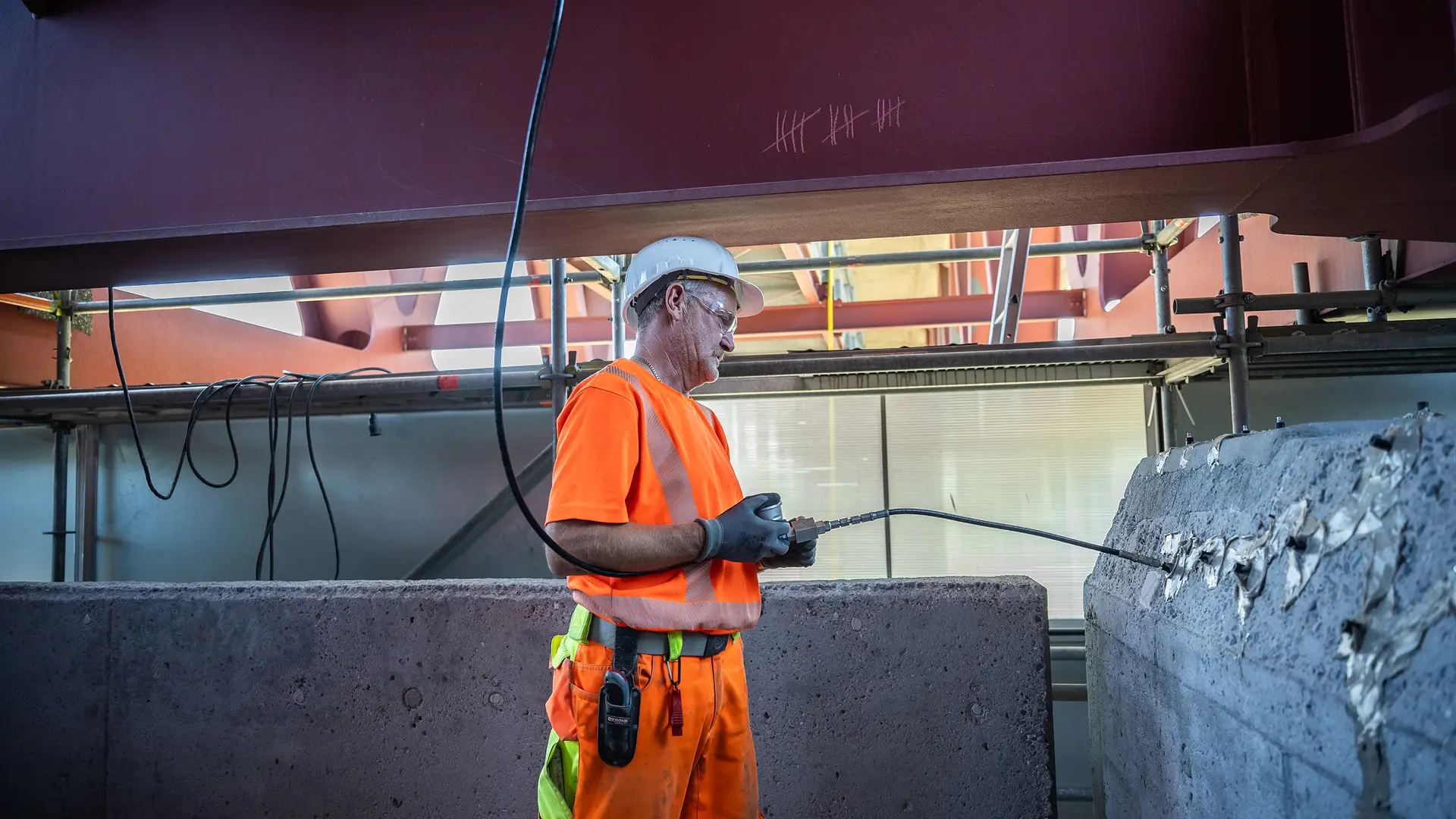 The focus at the start of work was on the pier caps. First, the subsoil was prepared extensively over an area of 3,500 m². This was followed by tamping and grouting roughly 2,000 m of existing fractures. The final step was coating the entire processed surface of 3,500 m². The specialists on the injection platforms also installed 500 m² of sloping PCC with anchored stainless steel mats which were then sealed with a crack-bridging, walk-over surface protection system. In addition, 1,800 m of grooves were constructed for sensor technology and extensive measures were taken to protect the pier bases against penetrating moisture as well.